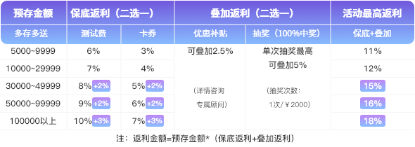 活動期間預存金額滿¥5000,即可享受多重返利,最高可達18%。(預存費用需在7月15日前到賬,若未到賬則視為自動放棄本次活動)