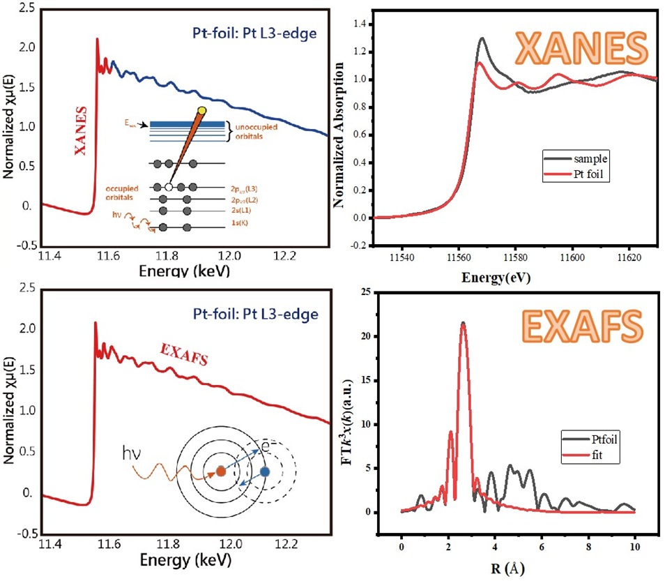 同步輻射光源與傳統(tǒng)X光射源的最大差異為可提供能量連續(xù)且高強(qiáng)度的光源,同時(shí)具有極佳的偏振性。利用此特點(diǎn)的代表技術(shù)即為X射線吸收能譜(X-ray absorption spectroscopy: XAS),分為兩個(gè)觀測(cè)范圍:X射線近吸收邊精細(xì)結(jié)構(gòu)(XANES)及延伸X射線吸收精細(xì)結(jié)構(gòu)(EXAFS)。